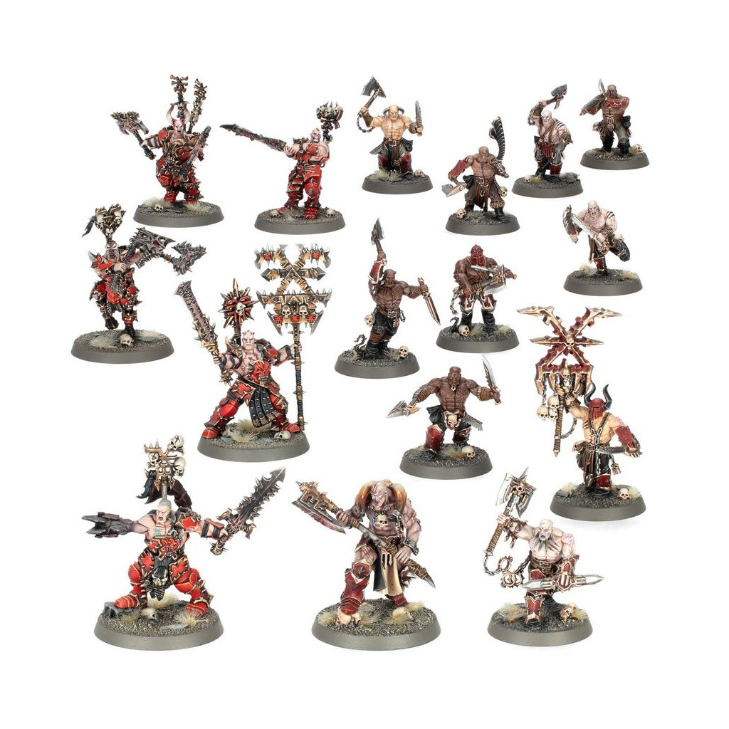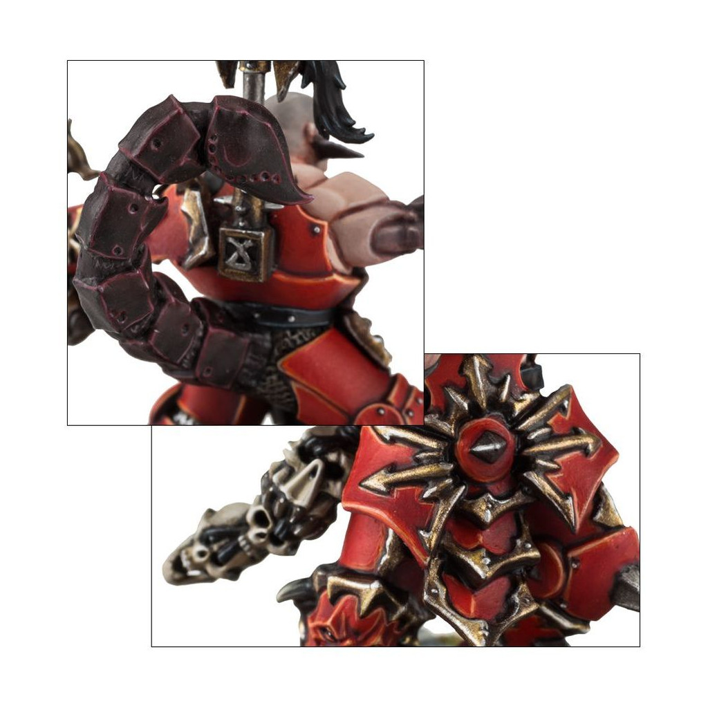 Zarxor est accompagné de cinq Collecteurs de Crânes et de dix Pillards de Sang, tous aussi avides de massacres que leur meneur. Sous l’impulsion frénétique de leur chef, ils se précipitent sans hésiter dans les combats les plus désespérés, semant la terreur dans les rangs ennemis. Leur engagement en tant que régiment mercenaire en fait une option tactique redoutable pour renforcer n’importe quelle armée du Chaos ou alliée.